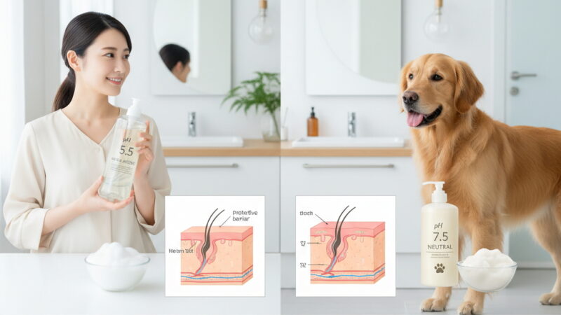 人間用シャンプーを犬に使用できない最も大きな理由は、犬と人間の皮膚の性質が根本的に異なるためです。特に「pH値」と「皮膚の薄さ」が大きく関わっています。